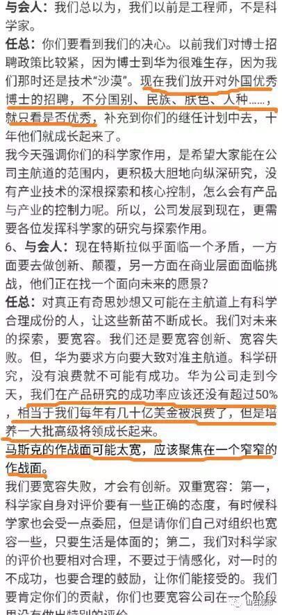 任总:你们要看到我们的决心。以前我们对博士招聘政策比较紧,因为博士到华为很难生存,因为我们那时还是技术“沙漠”。现在我们放开对外国优秀博士的招聘,不分国别、民族、肤色、人种……,就只看是否优秀,补充到你们的继任计划中去,十年他们就成长起来了。