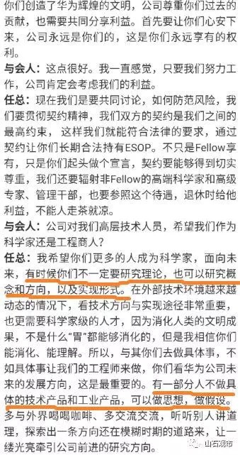 任总:现在我们是要共同讨论,如何防范风险,我们要贯彻契约精神,我们双方的契约是我们之间的最高约束, 这样我们就能符合法律的要求,通过契约让你们长期合法持有ESOP。不只是Fellow享有,只是你们起头做个宣言,契约要能够得到切实尊重,我们还要辐射非Fellow的高端科学家和高级专家、管理干部,也要参照这个待遇,退休时给他利益,不能人走茶就凉。