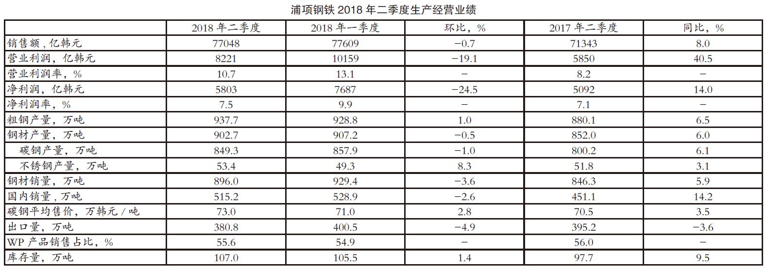 近期,美国与其他主要经济体的贸易摩擦加剧,欧盟启动贸易保护措施,韩国浦项集团通过预先和积极应对,将贸易限制的影响降至最低,在持续恶化的外部经营环境中依旧保持了稳健的发展势头。浦项集团近期公布的2018年二季度财报显示,集团销售总额为16.08万亿韩元,同比增加7.6%;营业利润为1.25万亿韩元,同比显著增长27.9%,连续四个季度突破1万亿韩元;营业利润率为7.8%,环比降低1.6个百分点;净利润为6366亿韩元,同比显著提高20.1%。