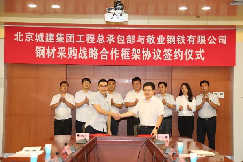 北京城建集团工程总承包部年度营销额已达百亿,专业承揽国家级重点工程,建筑钢材需求数量、质量等方面要求严格,为保障工程项目使用建筑钢材的供应数量及质量,有意选择有能力、信誉好、产品质量和服务保障均能满足的大型企业合作;敬业是全球大型螺纹钢生产基地,专注于生产精品钢材,品种丰富,货源充足,可满足多个工程多标段同时供货;经过前期北京大兴国际机场、北京城市副中心等多项目实际合作,最终双方于8月上旬签署《钢材采购战略合作框架协议》,强化合作。