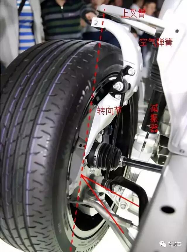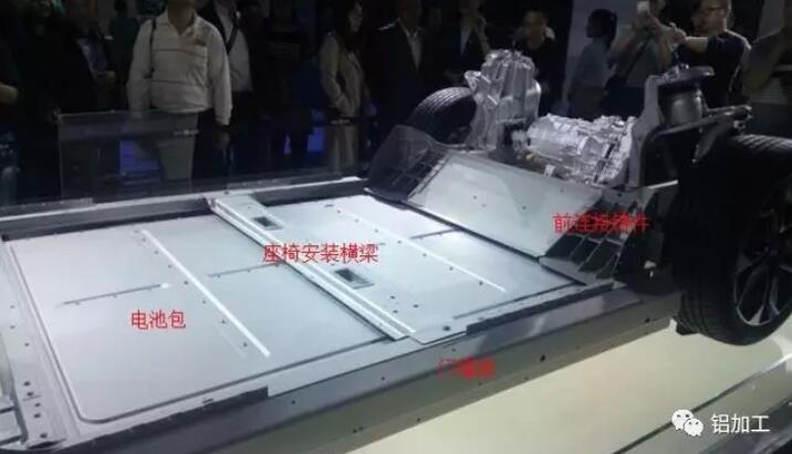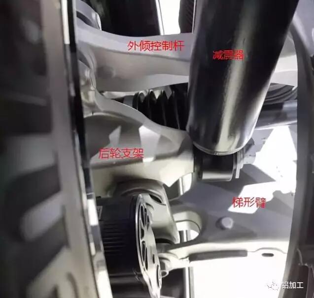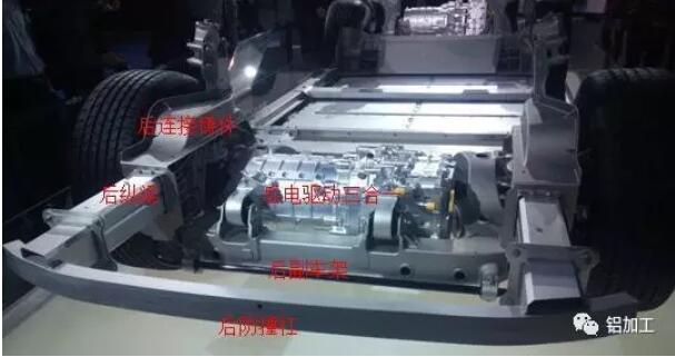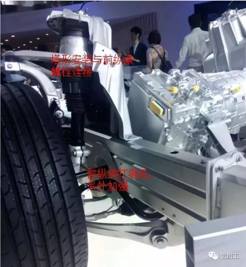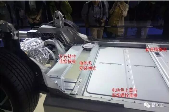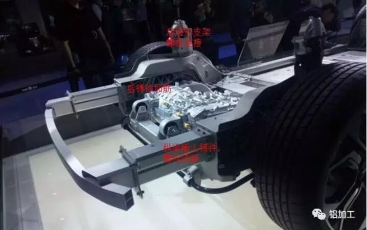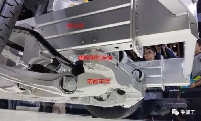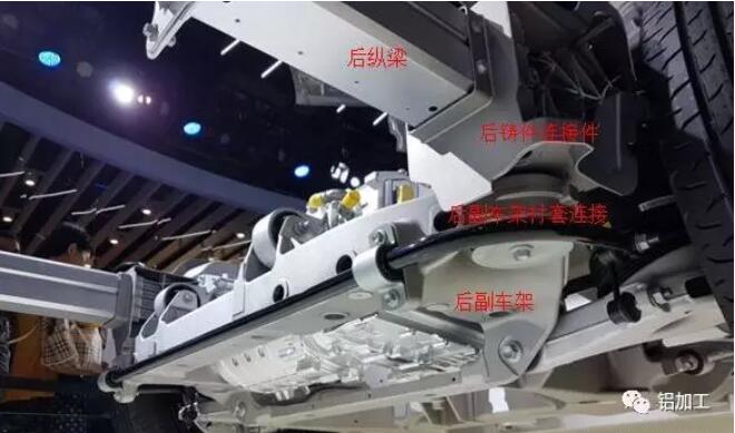 前、后副车架支撑悬架、电驱动系统,再用悬架支架把悬架上支点撑起来,再加几根横梁,下部装上电池下车身就完成了,悬架、副车架也都是铸铝件。