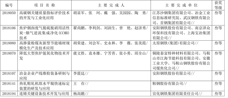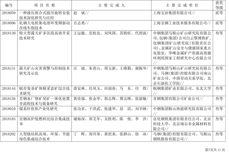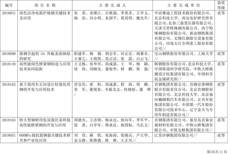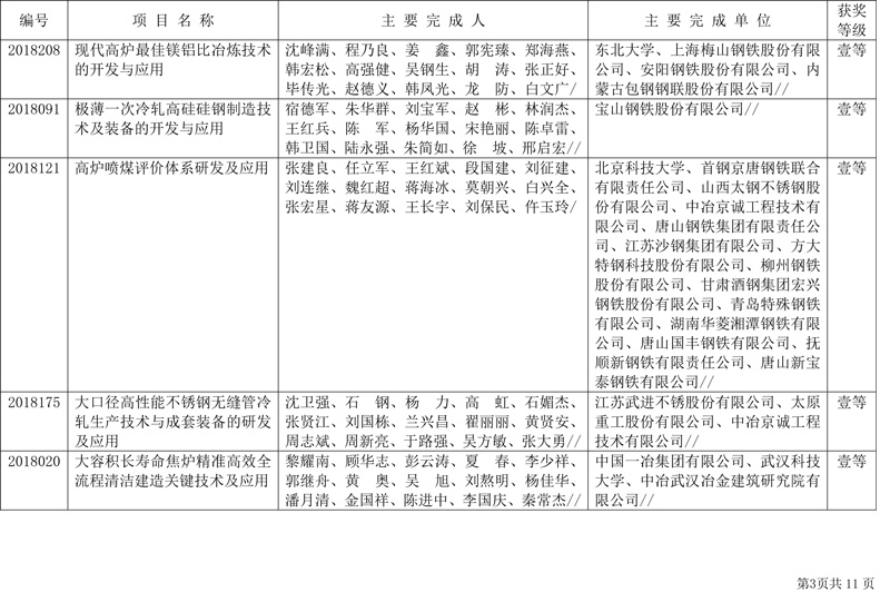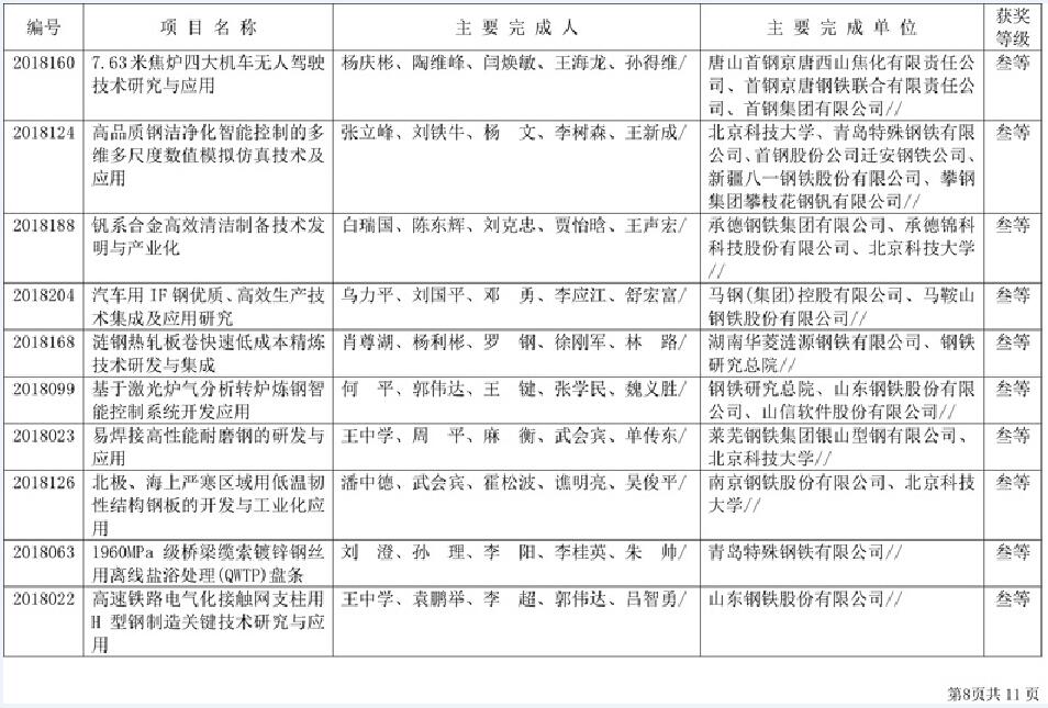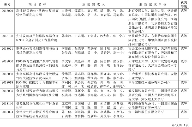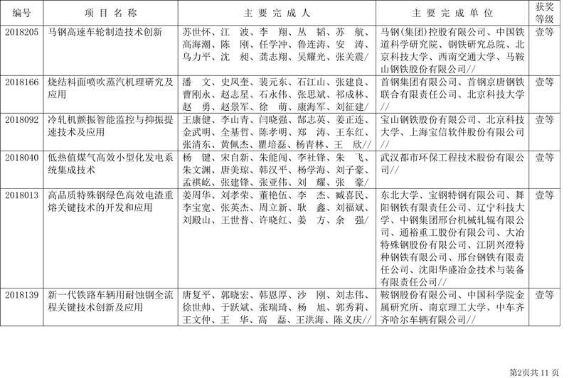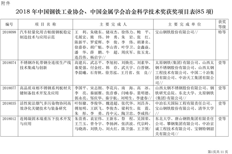附件:2018年中国钢铁工业协会、中国金属学会冶金科学技术奖获奖项目表(85项)