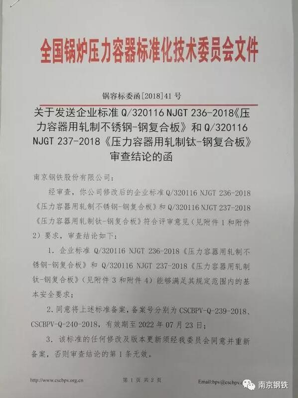 7月24日,全国锅炉压力容器标准化技术委员会特地给南京钢铁股份有限公司(南钢)发来复合板审查结论函,同意将南钢企业标准Q/320116 NJGT 236-2018“压力容器用轧制不锈钢-钢复合板”、Q/320116 NJGT 237-2018“压力容器用轧制钛-钢复合板”备案,有效期至2022年7月23日。