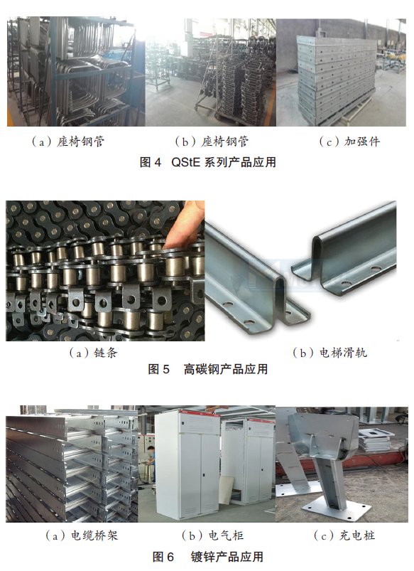 图4为用于制作轿车座椅钢管、加强件、车厢板等的QStE系列产品,产品可满足冲压、整形等制造供需,生产连续稳定、产品质量可靠。采用1.0mm和1.2mm QStE 380TM牌号可代替原来Q235B牌号制作轻卡车厢侧板、围板、底板、横梁和纵梁,通过厚度减薄而强度、抗疲劳性能更加可靠,可为轻卡减重17%,实现轻卡轻量化设计。