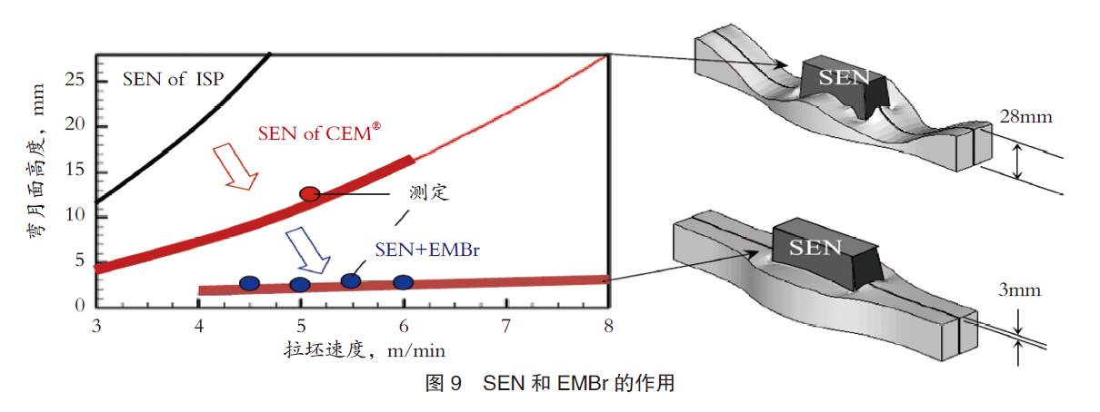 1)浸入式水口(SEN)的尾流现象:如图8(a)所示,频率约为0.1Hz的周期性波动时,在大产量浇铸过程中,在结晶器弯月面上观察到了一种尾流现象。带有浦项电磁制动(EMBr)液芯形状的SEN优化设计是一项重要的技术。如图9所示,弯月面液面波形可控制在5mm以内。