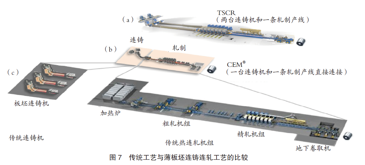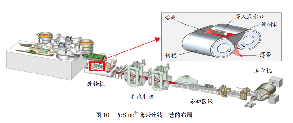 薄带连铸是一种直接从钢水生产薄带的创新工艺。该工艺不包括复杂的热轧工艺,而且与传统铸轧工艺相比,有诸多优点。该工艺可以灵活生产特殊钢种,而传统的连铸和热轧工艺则难以实现。