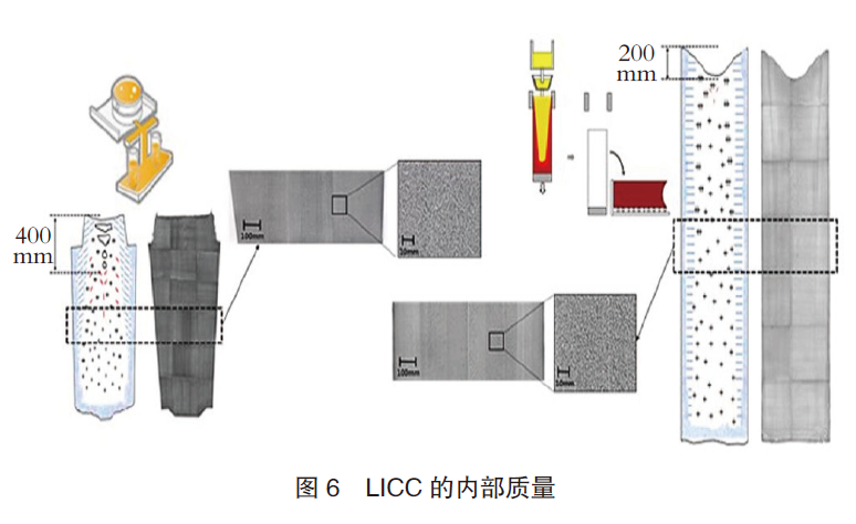 鉴于LICC已经发展成为一种半连铸型技术,其连铸流的产量低于多炉连铸,因此仍需改进。主要的关键技术如图5所示,研究发现等轴晶区的显微组织结构有所扩大,这表明,在含C量为0.4%的合金钢中,其结构组织是由细小的球状晶体组成。在较低的拉坯速度和搅拌速度下,LICC内的钢水内部质量与类似的横断钢锭(6t)相当。但是,在半连铸型铸机中,连铸流上部区域的缩颈管会直接影响产量。如图6所示,将连铸流上部的缩颈管减至最少,就是一项核心技术。为了实现从连铸流底部到顶部的定向凝固,采用了一种冷却控制技术。LICC连铸工艺金属收得率可达90%左右,而铸锭工艺仅为70%。
