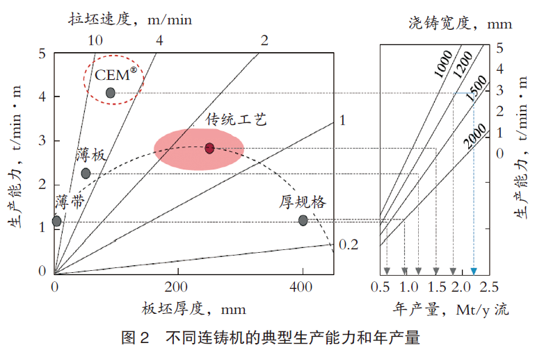 图2显示的是,板坯连铸机在单位浇铸流数以及单位板坯宽度上的生产能力。从生产效率的角度来看,厚度为200-300mm、拉坯速度为1.0-2.0m/min的传统板坯连铸机生产能力最高,而生产其他厚度板坯的连铸机则略逊一筹。值得关注的是,浦项的薄板坯连铸和无头轧制工艺CEM®的生产能力可达4.5t/min,远高于传统板坯连铸工艺。