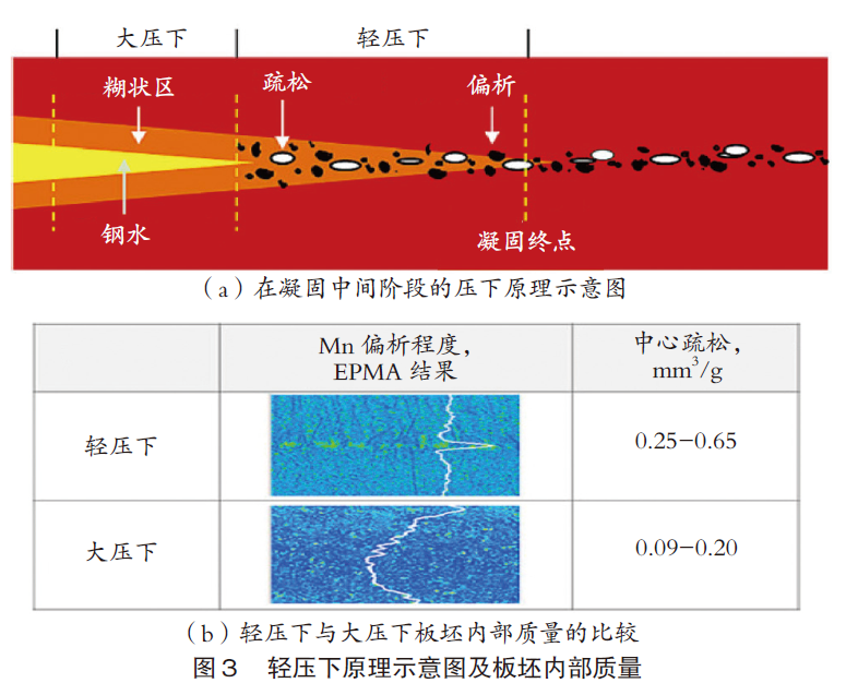 浦项于2011年在浦项钢厂建立了400mm的板坯连铸机,还特别设计了一种新型的立式固态矫直连铸机(VSU),设备高度和建造成本以及维护成本都有所降低。为了在立式连铸机的生产基础上,尽可能减少夹杂物带和内部裂纹,引进了长度为3.2m的垂直截面,在矫直之前就完成了凝固,如图4(a)所示。在这一布局上,连铸机长度缩减至23.9m,因此拉坯速度最大为0.42m/min,由于拉坯速度低,在这台设备上所开发的技术,可以显著改善板坯内部质量或角部裂纹,而非提高生产效率,如图4(b)所示。