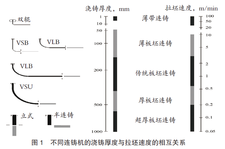 在近50年的时间里,为了提高生产效率、产量和能效,同时节约生产成本,数量众多的板坯连铸机已经广泛安装于全世界的工厂。本研究根据拉坯速度和板坯厚度,将板坯连铸工艺分为五种类型,如图1所示。