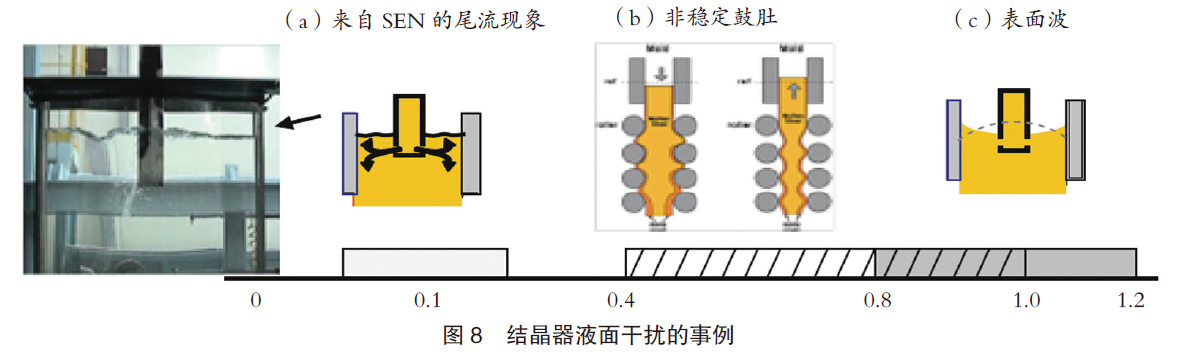 TSER工艺必须在一条连铸产线和一条轧制产线之间进行直接连接配置。作为无头轧制工艺配置,需要在连铸产线和轧制产线之间维持流量平衡。在全无头轧制过程中,轧制速度取决于拉坯速度,这意味着当拉坯速度不够高时,材料温度过低,如果精轧机进口温度(FDT)不够,热轧带钢就会出现混合的晶粒结构,这就是一种缺陷。为了阐明结晶器液面波动的机理,浦项在不同类型的连铸机上开展过各类试验,最终实现了结晶器液面稳定,相关的三大关键性要素如图8所示。
