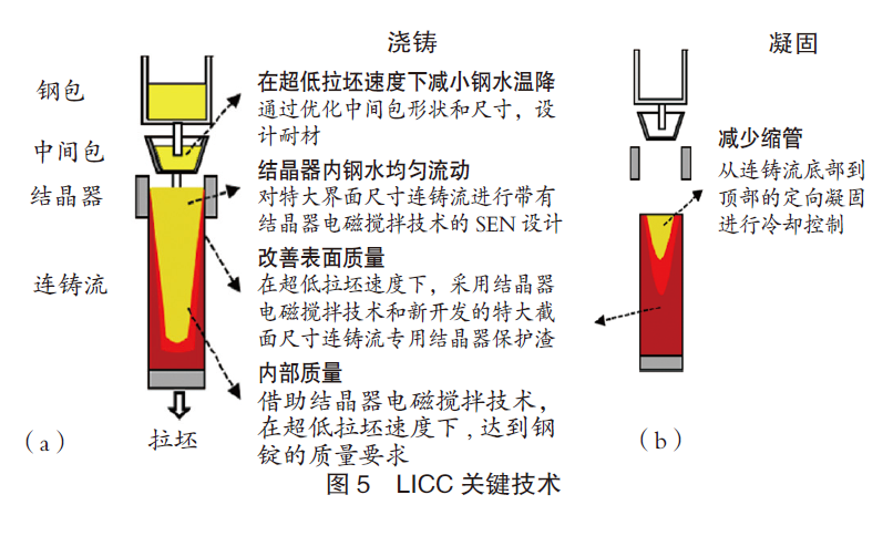 LICC工艺采用了半连铸型连铸机,可分为三个子工序:(a)拉坯;(b)凝固;(c)精整。连铸流的厚度为700mm,并由结晶器电磁搅拌系统、振动器、拉坯机、推进机和翻坯机等组成。