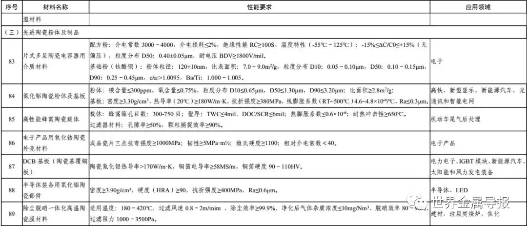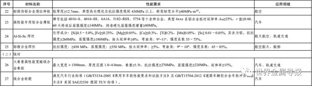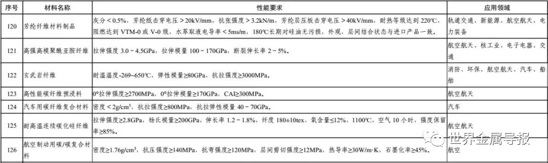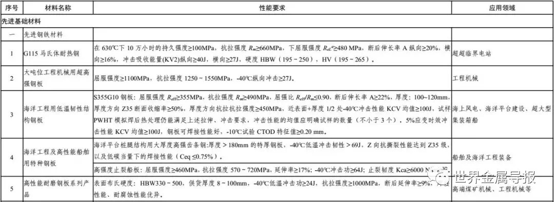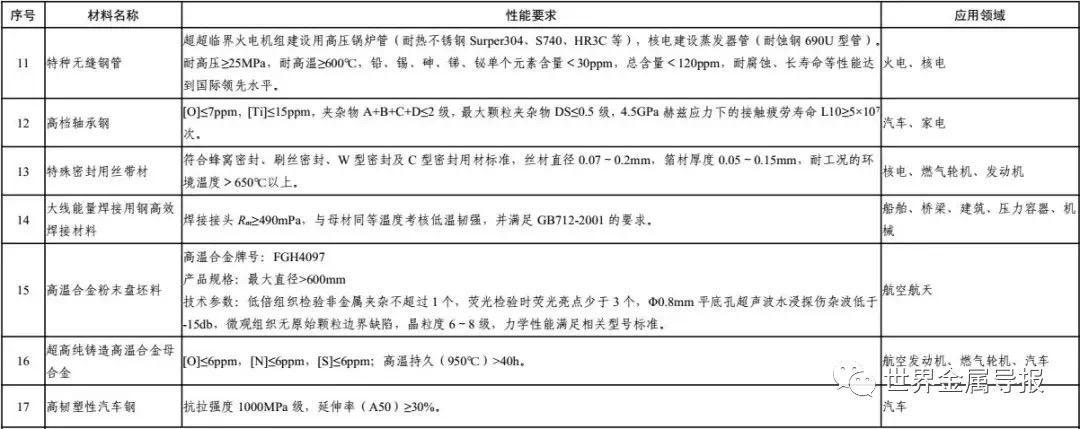 其中,先进钢铁材料包括17种,材料名称、性能要求及应用领域具体如下: