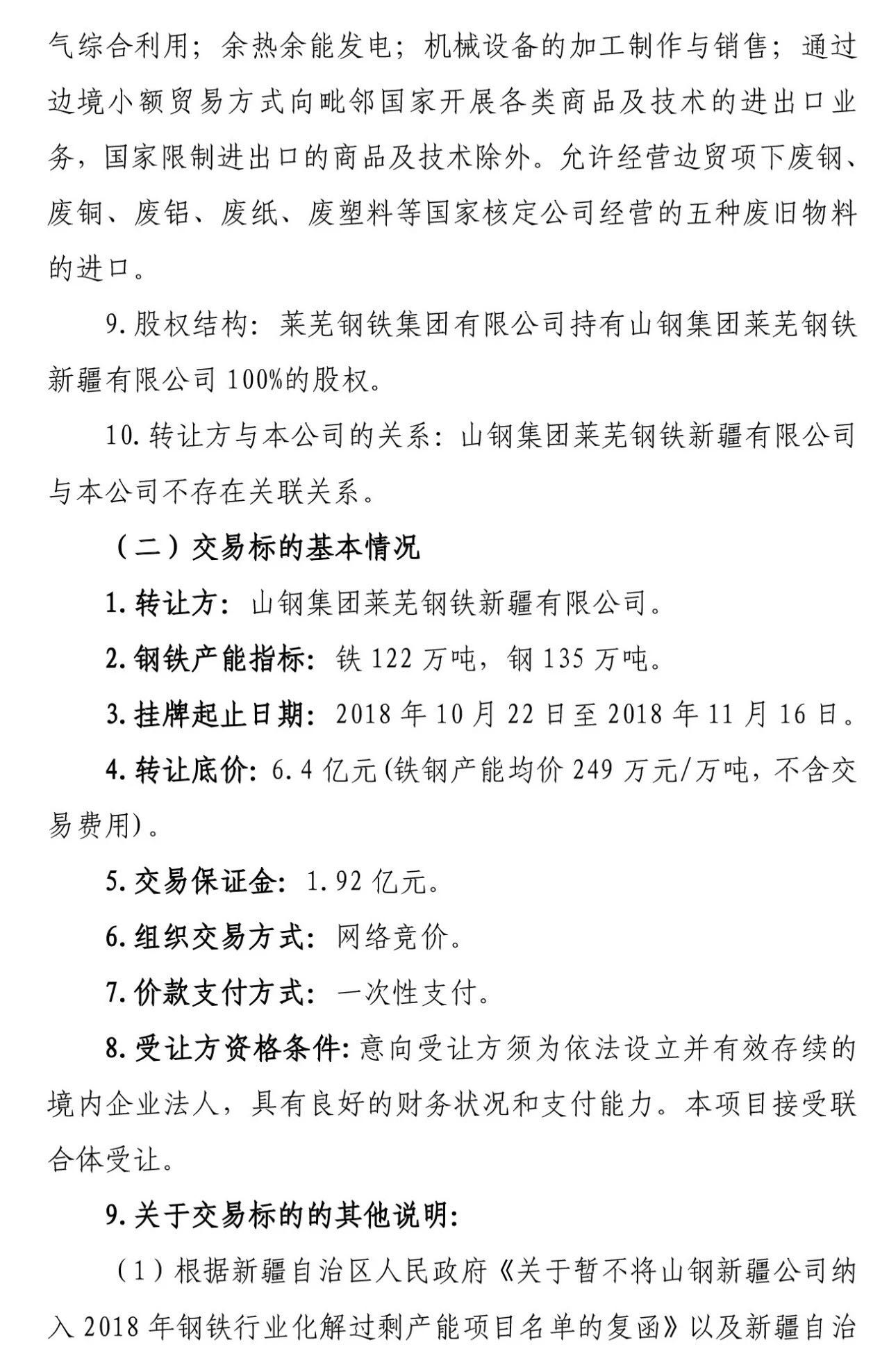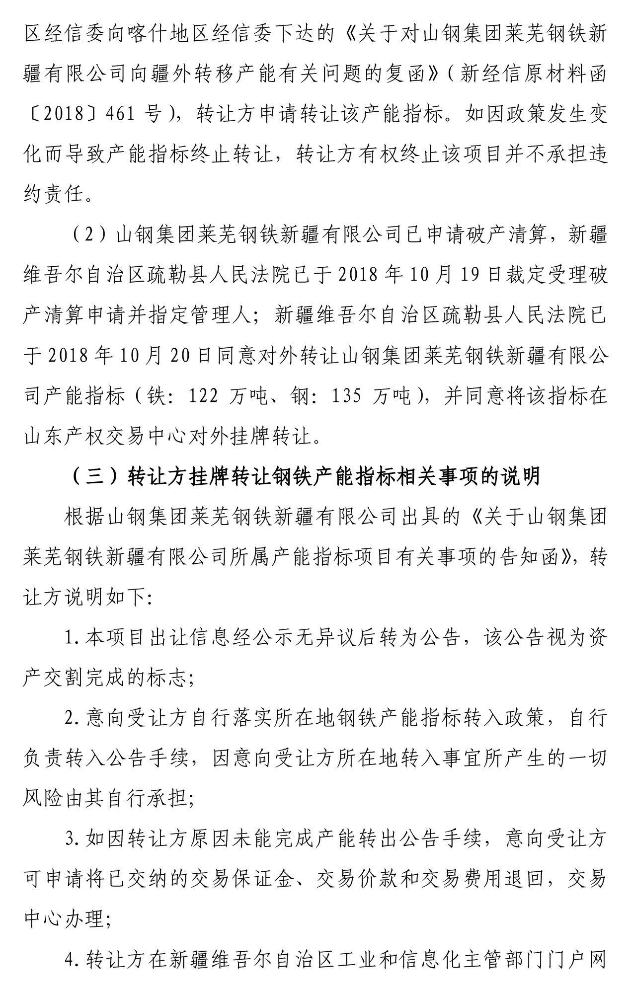 来自山东产权交易中心的信息显示,莱钢新疆已申请破产清算,新疆维吾尔自治区疏勒县人民法院已于2018年10月19日裁定受理甲方的破产清算申请并指定管理人。莱钢新疆转让产能指标,也得到了法院允许。当地法院已于10月20日同意对外转让山钢集团莱芜钢铁新疆有限公司产能指标(铁122万吨、钢135万吨),并同意将该指标在山东产权交易中心对外挂牌转让。
