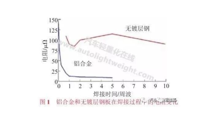 铝合金的熔点为 520~660 ℃,铝合金表面有一层致密的氧化膜,厚度小于 0.01 mm,熔点约 2 000 ℃。电阻点焊过程中,热量输入使熔池温度略高于铝合金熔点,但远远无法达到氧化膜的熔点,因此,氧化物无法熔化。此外,氧化膜具有低导电性和低导热性。因此,电阻点焊如何在焊接开始时保证氧化膜的刺穿和破碎是需要解决的一个重要问题。氧化膜对气体具有吸附作用,容易形成气孔,同时,无法熔化的氧化膜在焊核中容易形成非金属夹杂物。图 1 示出铝合金和无镀层钢板在焊接过程中的电阻变化。