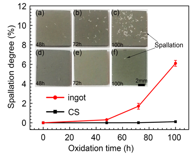 ▲图1 1200℃下不同制备工艺下的氧化膜剥落量