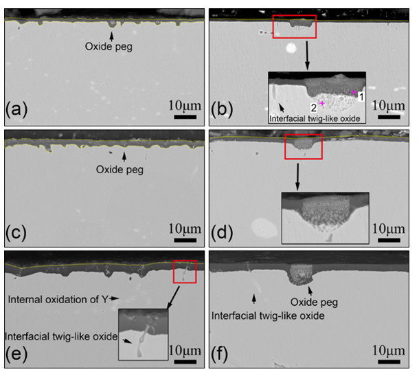 针对上述问题,刘振宇团队深入探索了富Y析出的尺寸对Fe-Cr-Al合金抗循环氧化性能的影响及其作用机理。他们通过双辊薄带连铸生产出了相对于传统铸造来说尺寸更加细小的富Y析出相。通过在1200℃开展抗循环氧化实验来评估氧化膜的粘附性,研究发现拥有细小的富Y析出相可以显著提高Fe-Cr-Al合金的氧化膜粘附性。通过多种微观分析手段研究界面孔洞,S在界面的偏析以及界面富Y氧化物的分布几种影响氧化膜的粘附性的因素,最终将细化的析出相使氧化膜粘附性得到优化的主要因素归因于界面氧化物的钉扎效应。在氧化过程中,经计算,细小的析出相可以产生更大的Y扩散到氧化膜/基体界面流量,从而产生大量的界面氧化物,把氧化膜钉扎到基体上,因此极大改善了氧化膜的粘附性。