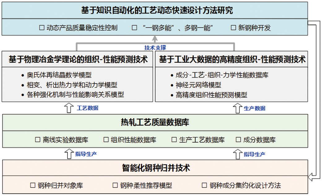 1热轧产品质量分析及判定。1)产品质量分析。基于钢铁热轧和冷轧生产线数据分布拓扑结构,打通热轧-冷轧-热处理数据壁垒,关联各工序和多控制层次知识,实现工业数据的采集、整理与挖掘;采用过程质量评价指标,基于工业大数据分析影响产品性能的关键工艺参数,明确性能和工艺参数的控制余量,为工艺调整提供指导。2)钢种归并规则的建立。在国家标准体系内,构建钢种柔性推荐模型,结合热轧板带材全流程工艺动态快速优化技术,建立多因素影响下钢种成分归并的技术指导方法,对相近性能的钢种进行成分集约化,在满足产品性能要求的条件下,减少炼钢牌号数量,实现余材板坯的充分利用,降低因混浇坯降级处理或判废造成的损失。
