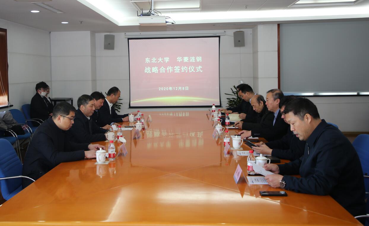 12月8日,东北大学与华菱涟钢战略合作签约仪式在主楼1401室举行。湖南华菱涟源钢铁有限公司党委书记、执行董事肖尊湖,副总经理李光辉,东北大学校长赵继,副校长孙雷,中国工程院院士王国栋出席会议。学校科学技术研究院、对外联络与合作处、轧制技术及连轧自动化国家重点实验室等相关部门负责人参加签约仪式。