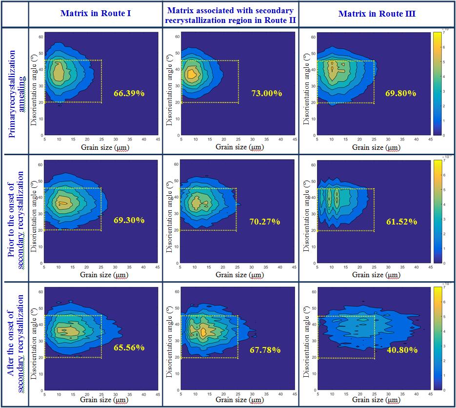 针对以上问题,宋红宇博士后在王国栋院士和刘海涛教授的指导下,设计了特殊的“追踪”实验,揭示了初次再结晶基体的微织构特征对二次再结晶的影响,提出了新的Goss晶粒异常长大环境的计算方法。结果表明,初次再结晶基体中大部分γ晶粒(<111>//ND)沿轧向呈“簇状”聚集分布时,二次再结晶开始后的基体仍然有利于准确Goss晶粒的异常长大,因而在高温退火后形成强烈的Goss织构和较高的磁性能。与此不同,当γ晶粒均匀分布时,不准确Goss晶粒将与准确Goss晶粒竞争长大,因而弱化了最终的Goss织构,降低了高温退火板的磁性能。研究结果为建立Goss晶粒异常长大环境与磁性能的关系提供了新的思路,是对现有二次再结晶理论的拓展和完善。