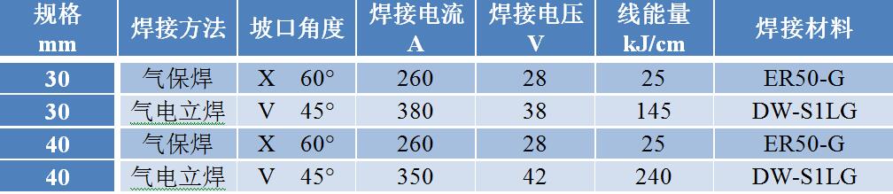工业生产选用Q355B普板,基本成分体系为0.17%C-Si-Mn-Nb系,冶炼工艺基于转炉流程,LF精炼时间≤30min。钢板采用高效轧制工艺,在1000℃以上进行高温终轧,提高了生产节奏,轧制厚度为30mm和40mm两种规格。钢板取样进行了焊接评定实验,采用气保焊和气电立焊两种焊接方法,焊接实验过程与参数如下。