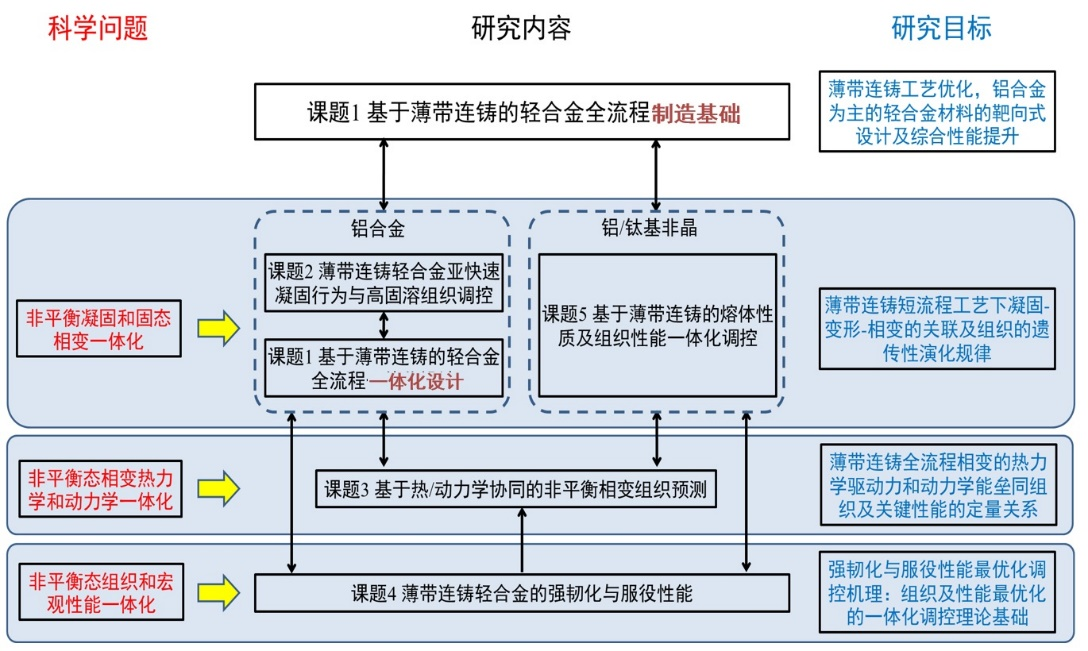 “基于薄带连铸亚快速凝固的非平衡相变与组织一体化调控”国家自然科学基金重大项目由东北大学牵头,吉林大学、西北工业大学、西安交通大学、中国科学院金属研究所作为参与单位共同完成。项目执行周期为2018年1月至2022年12月。项目的研究目标为:揭示凝固与相变中的组织遗传性规律,阐明热动力学关联性及其对性能影响,获得面向性能的组织一体化调控方法,实现轻合金材料的靶向式设计与性能提升。项目拟解决的关键科学问题为:非平衡凝固和固态相变一体化、非平衡态相变热力学和动力学一体化、非平衡态组织和宏观性能一体化。围绕研究目标及关键科学问题,项目设置五个课题:基于薄带连铸的轻合金全流程一体化设计及制造基础、薄带连铸铝合金的亚快速凝固行为与过饱和固溶组织调控、基于热/动力学协同的非平衡相变组织预测、基于薄带连铸的轻合金强韧化与服役性能研究及基于薄带连铸的熔体性质及组织性能一体化调控研究。项目实施路线图如图1所示。