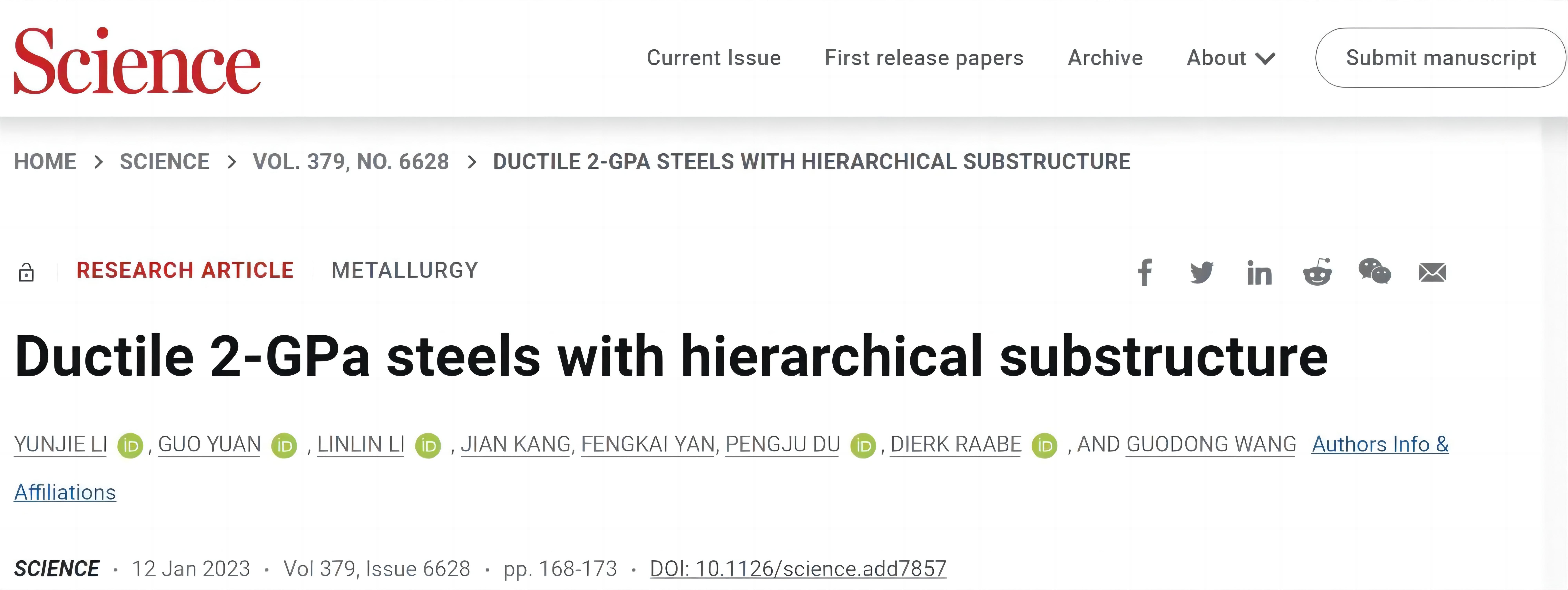 2023年1月13日,东北大学轧制技术及连轧自动化国家重点实验室王国栋院士/袁国教授研究团队在国际顶级期刊Science上以“Ductile 2-GPa steels with hierarchical substructure”为题,发表了在超高强钢铁材料增塑机制及组织创新设计方面的最新研究成果。