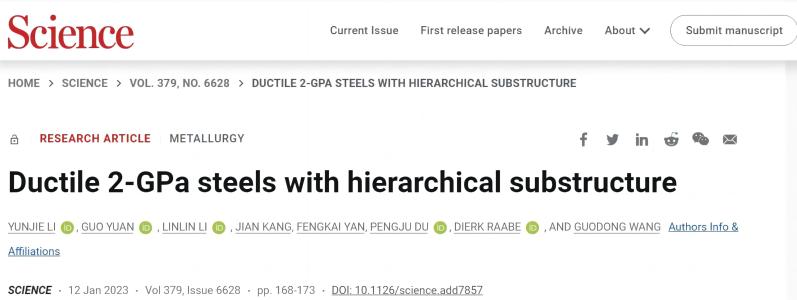 On January 13, 2023, Academician Wang Guodong/ Professor Yuan Guo's research team, from State Key Laboratory of Rolling and Automation of Northeastern University, published the latest research results in the plasticizing mechanism and organizational innovation design of ultra-high strength steel materials on the international top journal Science with the title of Ductile 2-GPa steels with hierarchical substructure.