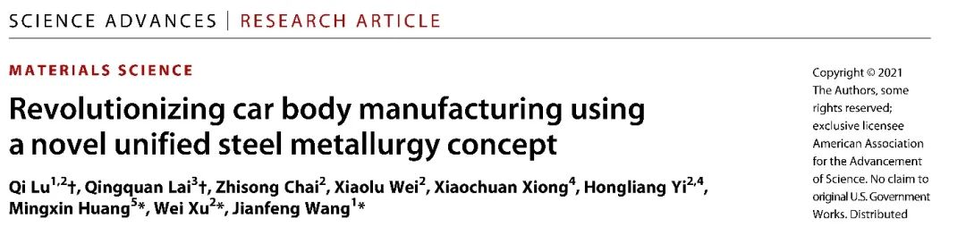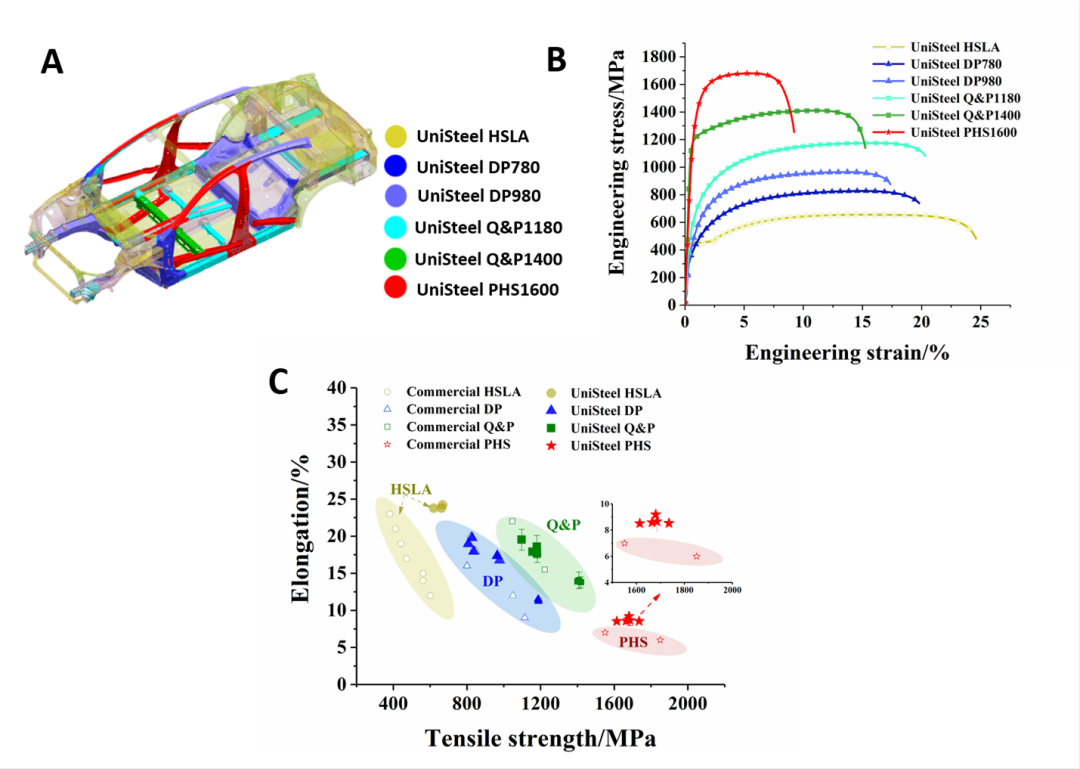 In view of this major issue of the industry development, materials scientists from General Motors China Academy of Science, Northeast University, Nanjing University of Technology, Yucai Tang (Suzhou) Materials Technology Co., Ltd. and Hong Kong University took a different approach and proposed to replace the existing various automobile steel components with a single steel alloy component, namely the concept of UniSteel. UniSteel can flexibly obtain various derivative steel grades with excellent performance through heat treatment. It is also a single component steel body in white. The performance of UniSteel body will be far better than that of the single low-carbon mild steel body in white in the 1960s. At the same time, UniSteel has also solved most of the systematic problems in today's multi steel body manufacturing, such as the lengthy steel certification process and material/ part/ subsystem verification. The UniSteel concept is a specific case of material normalization proposed by Academician Luca and others, which is expected to innovate the body manufacturing mode of the global automotive industry, and reduce the complexity of various links such as the design, procurement, production and manufacturing of steel body in white through the normalization of steel grades.This achievement was recently published on Science Advances, a sub journal of Science. The first author is Dr. Lu Qi, a senior researcher of General Motors China Academy of Sciences and a visiting professor of Northeast University. Associate Professor Lai Qingquan of Nanjing University of Technology is the co-first author. The corresponding authors are Wang Jianfeng, President of General Motors China Academy of Sciences, Professor Xu Wei from Northeastern University and Professor Huang Mingxin from Hong Kong University. The authors of the paper also include Dr. Xiong Xiaochuan and Professor Yi Hongliang from Yucai Tang (Suzhou) Materials Technology Co., Ltd., and two doctoral students of Professor Xu Wei's research group, Chai Zhisong and Wei Xiaoliao.