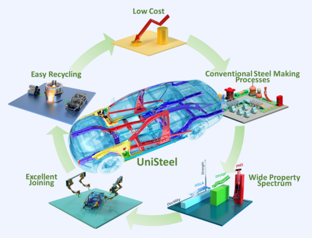 To sum up, by ingeniously designing the alloy composition of UniSteel, the steel grades with single composition can obtain different microstructures through the existing mature production process, thus providing more excellent mechanical properties than the existing steel grades and realizing the lightweight of the steel body in white. The concept of UniSteel represents a new technology path, which can greatly simplify the design, manufacturing and recycling of steel BIW. The concept of UniSteel also fundamentally challenges the traditional understanding that appropriate materials are used for appropriate parts. In fact, UniSteel put forward the concept of appropriate performance is used for appropriate parts. The ingenious composition design and the accumulation of traditional physical metallurgy knowledge for a century perfectly realizes the 1 and N mapping relationship between composition and performance. The authors hope that the UniSteel concept is expected to revolutionize the body design and manufacturing model of the global automotive industry, significantly reduce the carbon emissions of body steel while lightening the body, and thus help the automotive industry achieve carbon neutrality in a short time.