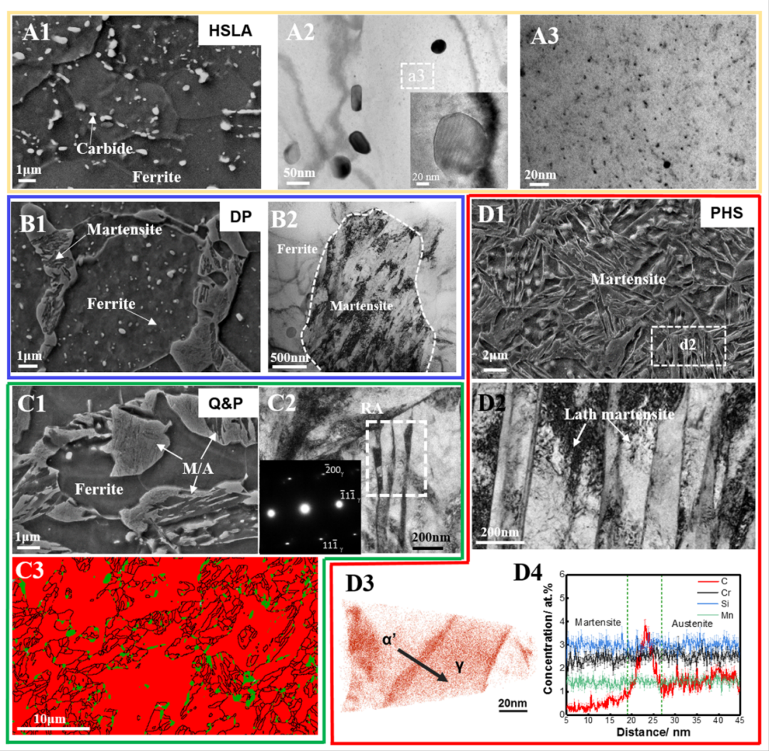 The UniSteel concept needs to meet a series of system performance requirements, as shown in Figure 1. Firstly, UniSteel must be low-cost and easy to recycle. Secondly, it must be able to conduct large-scale production through the current mature steel process, including steelmaking, continuous casting, hot rolling, pickling, cold rolling and annealing. Then, UniSteel parts must be able to use the existing heat treatment and machining processes to obtain the required structure and properties. Finally, Unisteel derived steel grades should have good resistance spot welding performance. Based on the above considerations, the researchers learned from the design concepts of several current major advanced high-strength steels, selected low-cost carbon (C), manganese (Mn), silicon (Si) and chromium (Cr) as the main alloy elements, and used niobium (Nb) as the microalloy element. Through mature heat treatment process, ferrite, martensite, austenite, nano carbide and other phases were flexibly combined to obtain the corresponding microstructures of HSLA, DP, Q&P and PHS steel grades derived from Unisteel, as shown in Figure 2. At present, UniSteel has successfully conducted hundred ton industrial scale tests in four steel plants in China and the United States, and has manufactured hot rolled and cold rolled coils of several thicknesses using the existing automobile steel production process. The cumulative trial production scale is close to 1000 tons. Among them, two steel plants adopt a short process steel production process based on electric furnace steelmaking, which uses about 50% of scrap steel, thus greatly reducing carbon emissions per ton of steel.